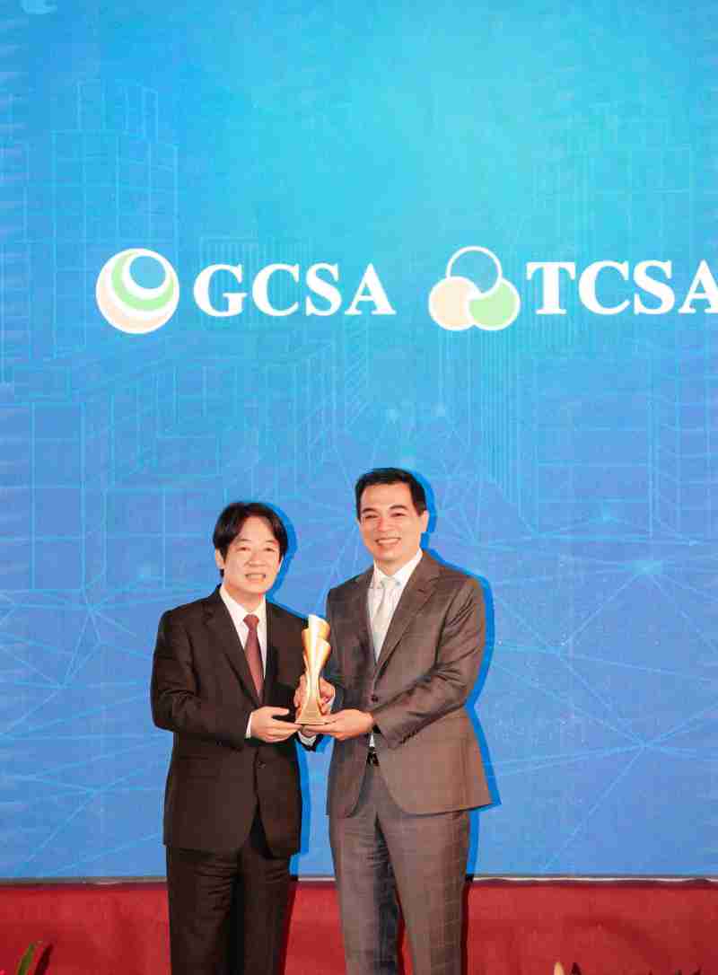 达全方位永续表现获全球永续奖及台湾永续奖肯定,,由副总统赖清德颁奖 (左),,,,尊龙z6总经理柯富仁 (右) 代表领奖