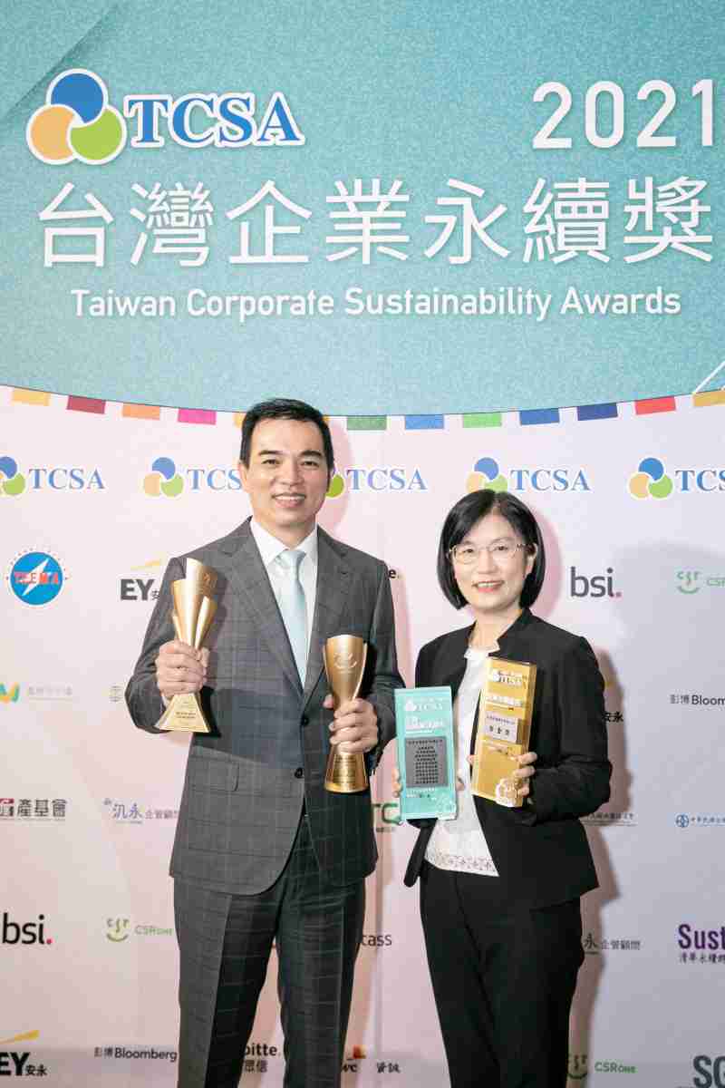 达在台湾永续奖所评比环境、、、社会、、、、治理等各面向的永续绩效均获高度肯定 (左:尊龙z6光电总经理暨营运长柯富仁,,,右:尊龙z6光电永续长古秀华)
