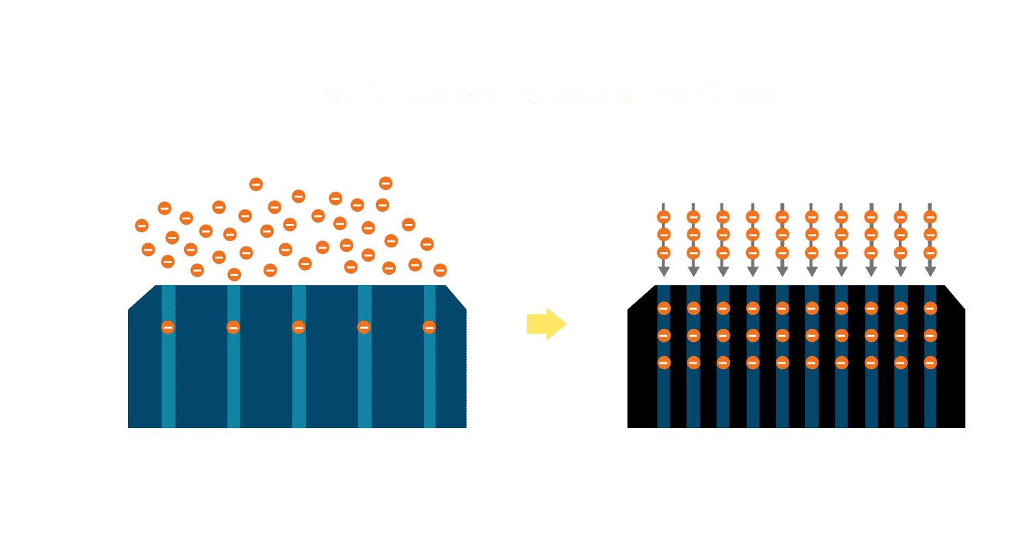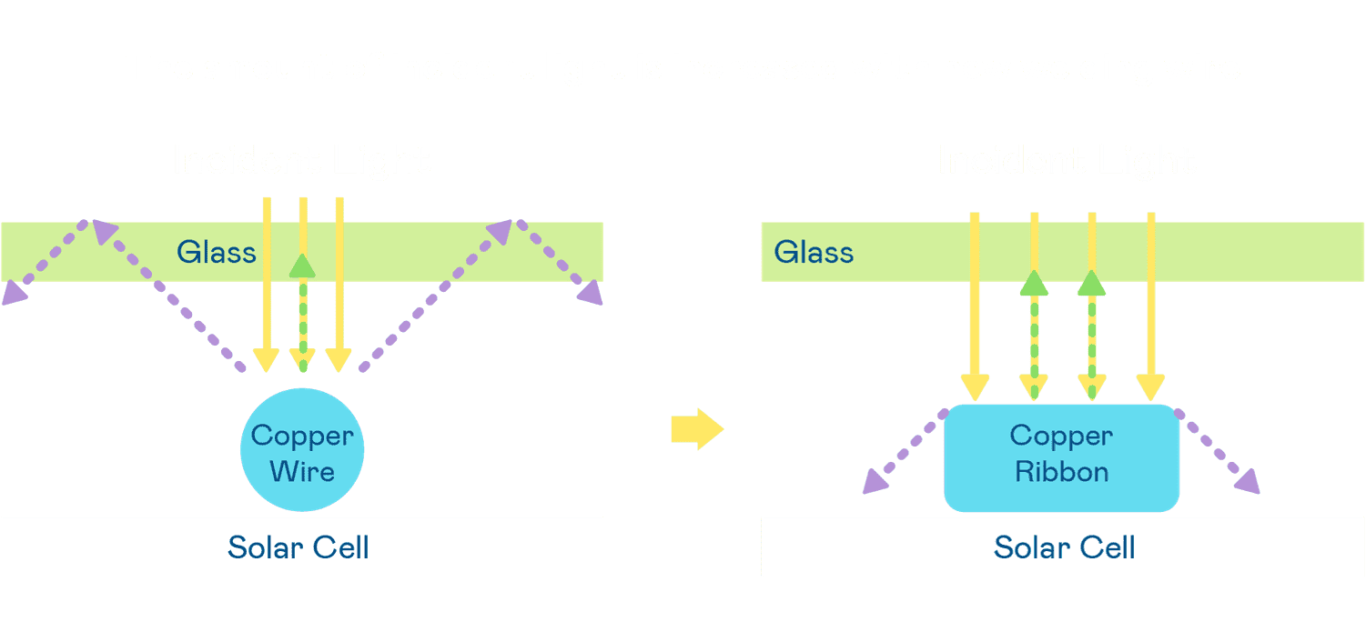 - 电池使用多条铜导线 (Copper wire) 于电池片上形成较短的电流路径,,,提高电流收集效率,,,采用圆形设计的铜导线较传统扁平式的铜焊带 (Ribbon),,,,可增加入射至电池的光线量。。。