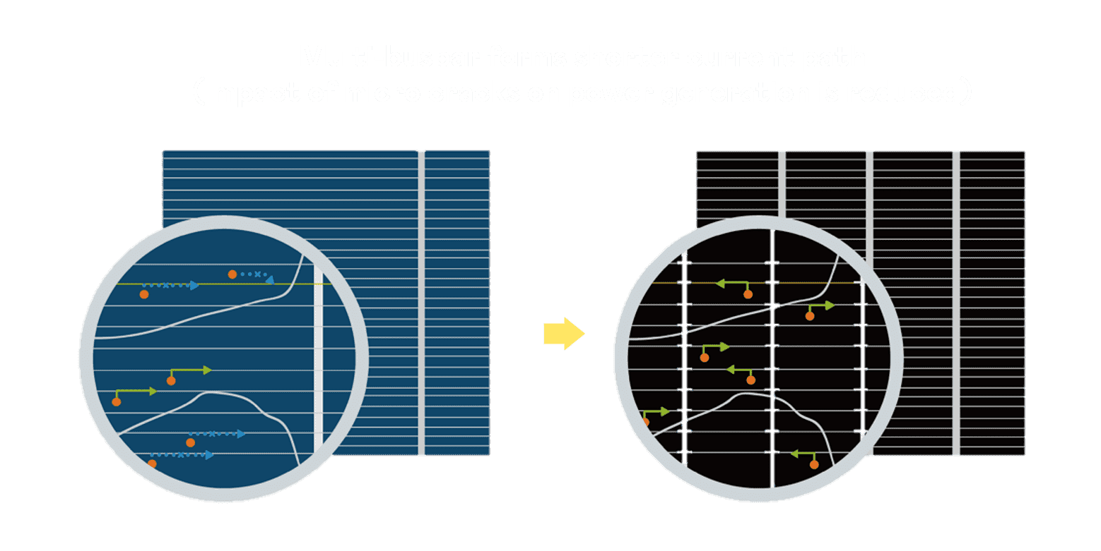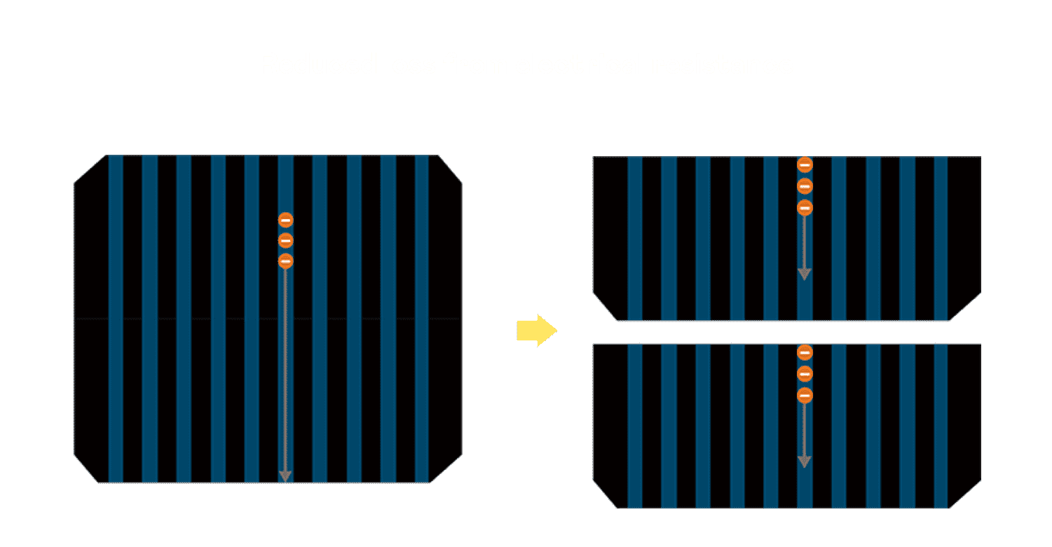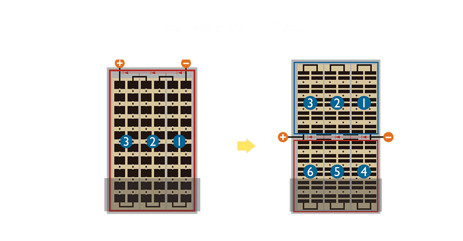 - 结合半切电池,,,降低遮阴影响、、、提升模组抗隐裂能力、、、并减少电阻损耗,,,,进一步提升模组发电效能。。