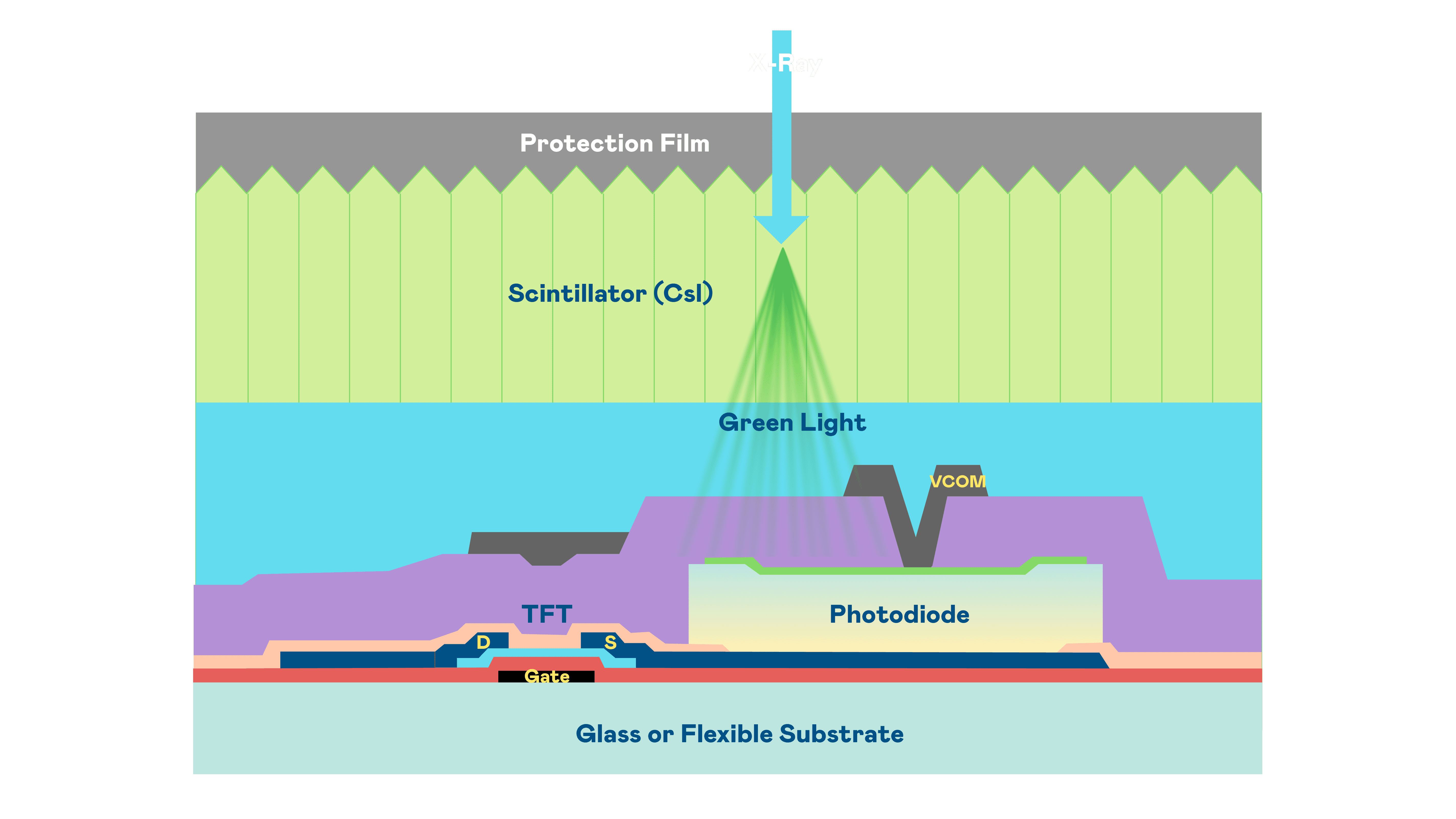 尊龙z6的X光影像感测阵列使用薄膜电晶体 (TFT) 作为每个像素的读取开关,,,搭配光电二极体(Photodiode)的光电转换元件,,用以感测X光影像讯号。。。